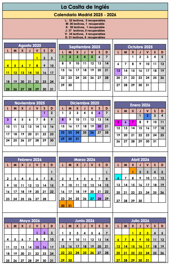 Hay un total de 37 sesiones lectivas (sumando lectivas reales y NO lectivas RECUPERABLES) cada día de la semana de lunes a sábados.