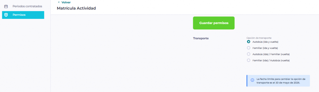 Para cambiar la opción de transporte, en el menú de la izquierda tienes que entrar en Permisos